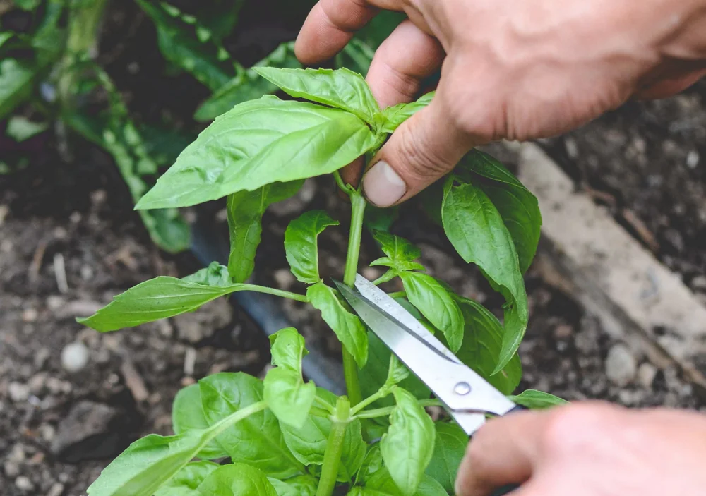 To harvest basil, simply use your fingers or a pair of scissors and cut back the top part of any stem that is becoming elongated. You can start to pinch your basil once the plant is 6” tall. When harvesting, trim each branch back to the next set of leaves. If any branches seem excessively long, you can pinch back two or even three sets of leaves.